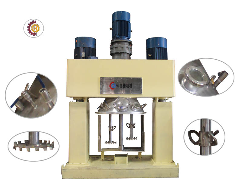 本機是一種無死點高低速結合、強力分散混合攪拌設備,適用于化工、輕工、食品、制藥、建材、農藥等行業的固—液、液—液相物料的混合、反應、溶解、分散等工藝,如粘膠劑、硅酮密封膠、聚氨酯膠、丙稀酸膠、汽車密封膠、及封裝膠、軟膏及漿糊狀物料、潤滑脂及油漆、膏狀化妝品、油墨及顏料及乳劑、膏狀食品及添加劑等的制作這種混合機可以與各種生產形式同時進行,單速、雙速、變速、三種速度可供選擇,滿足各種工藝要求。強力分散機釜內有三種不同形式的攪拌器,其中一個攪拌器慢速刮壁旋轉,其余兩面攪拌裝置又以不同的轉速繞自身軸線高速運轉,使物料在釜內作復雜的運動,受到強烈的剪切和搓合。設備內山形刮壁刀繞釜體軸線轉動,將粘在壁上和底部的原料刮出參與混合,使其效果更為理想。設備密封性好,可抽真空,具有良好的排氣除泡效果。設備釜蓋可液壓升降。釜體可自由移動,操作十分方便。攪拌器的形式,根據物料要求可為多層漿葉式、框式、蝴蝶式、外輪式等。