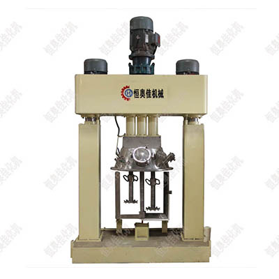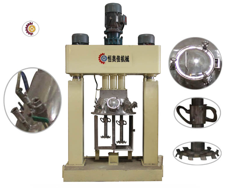 本機(jī)是一種無死點高低速結(jié)合、強(qiáng)力分散混合攪拌設(shè)備,適用于化工、輕工、油漆、油墨、食品、制藥、建材、農(nóng)藥等行業(yè)的固—液、液—液相物料的混合、反應(yīng)、溶解、分散等工藝,如粘膠劑、硅酮密封膠、聚氨酯膠、丙稀酸膠、汽車密封膠、及封裝膠、軟膏及漿糊狀物料、潤滑脂及油漆、膏狀化妝品、油墨及顏料及乳劑、膏狀食品及添加劑等的制作。這種混合機(jī)可以與各種生產(chǎn)形式同時進(jìn)行,單速、雙速、變速、三種速度可供選擇,滿足各種工藝要求。強(qiáng)力分散機(jī)釜內(nèi)有三種不同形式的攪拌器,其中一個攪拌器慢速刮壁旋轉(zhuǎn),其余兩面攪拌裝置又以不同的轉(zhuǎn)速繞自身軸線高速運轉(zhuǎn),使物料在釜內(nèi)作復(fù)雜的運動,受到強(qiáng)烈的剪切和搓合。釜體可電加熱、蒸氣加熱及油水循環(huán)加熱。夾套內(nèi)盤管可實現(xiàn)冷卻。釜體內(nèi)壁為大型立車精加工,確保活動刮刀在旋轉(zhuǎn)時把釜體內(nèi)壁及釜底的物料完全刮掉。設(shè)備內(nèi)山字形刮壁刀繞釜體軸線轉(zhuǎn)動,將粘在壁上和底部的原料刮出參與混合,使其效果更為理想。設(shè)備密封性好,可抽真空,具有良好的排氣除泡效果。設(shè)備釜蓋可液壓升降。釜體可自由移動,操作十分方便。攪拌器的形式,根據(jù)物料要求可為多層漿葉式、框式、蝴蝶式、外輪式等。本機(jī)尤其適合密封膠、原子灰等粘稠物料的邊攪拌邊排除氣泡,效率是研磨機(jī)的幾倍。