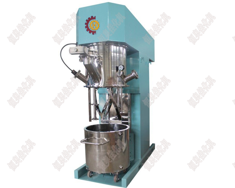 4、設備上裝有低速攪拌部件和高速分散部件,均采用變頻調速可根據不同工藝流程及 不同的粘度進行自我選擇。低速攪拌部件采用行星齒傳動,攪拌漿在公轉時也能自轉使 物料上、下及四周運動,使物料在很短時間內達到理想的混合效果。高速分散部件與行 星架一起公轉,同時高速自轉使物料受到強烈的剪切與分散混合,其效果為普通混合機 的幾倍。