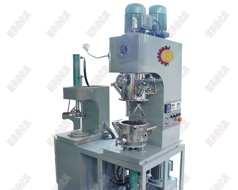 4、設備上裝有低速攪拌部件和高速分散部件,均采用變頻調速可根據不同工藝流程及 不同的粘度進行自我選擇。低速攪拌部件采用行星齒傳動,攪拌漿在公轉時也能自轉使 物料上、下及四周運動,使物料在很短時間內達到理想的混合效果。高速分散部件與行 星架一起公轉,同時高速自轉使物料受到強烈的剪切與分散混合,其效果為普通混合機 的幾倍。