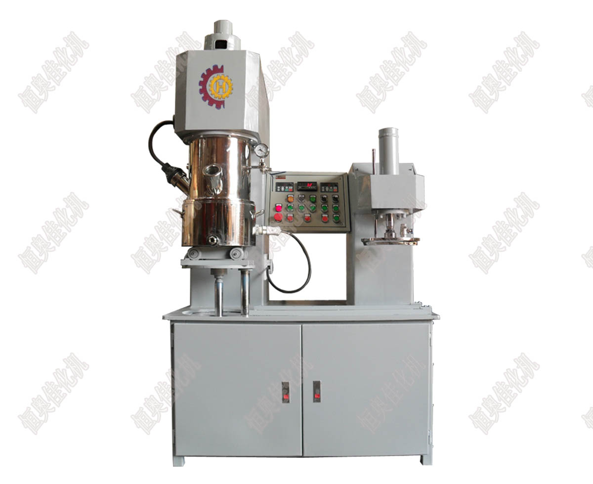 4、設備上裝有低速攪拌部件和高速分散部件,均采用變頻調速可根據不同工藝流程及 不同的粘度進行自我選擇。低速攪拌部件采用行星齒傳動,攪拌漿在公轉時也能自轉使 物料上、下及四周運動,使物料在很短時間內達到理想的混合效果。高速分散部件與行 星架一起公轉,同時高速自轉使物料受到強烈的剪切與分散混合,其效果為普通混合機 的幾倍。